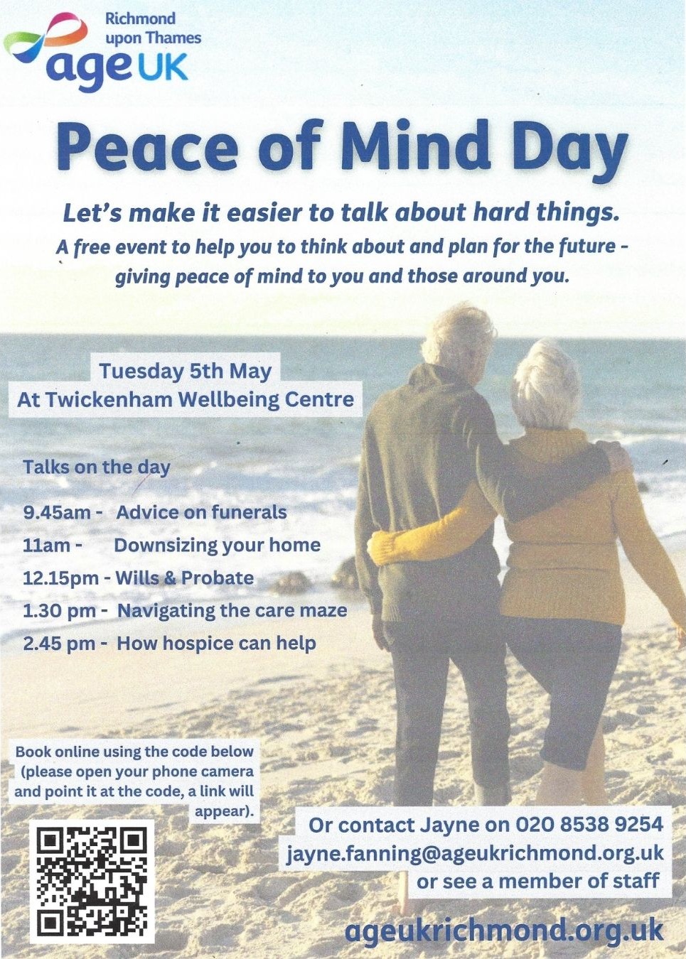 We would be delighted if you would join us at Age UK Richmond’s Peace of Mind day on 5th May 2026 from 0930 at the Twickenham Wellbeing Centre. Ashley will be talking about downsizing at 1100, Poppy’s Funerals will be there talking at 0945 and you can also get advice about wills & probate, navigating care, and hospice care. More details can be found by scanning their QR code and scrolling down to the 5th May event.